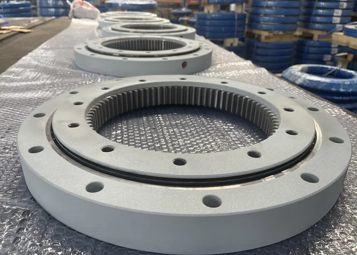 The main components of a slewing bearing include an inner ring, an outer ring, rolling elements (such as balls or rollers), a cage to separate the rolling elements, and sometimes sealing elements to protect against contaminants.